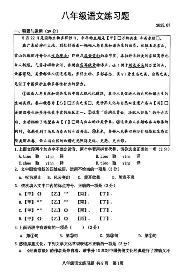 2024-2025学年山东泰安岱岳区八年级下学期语文期末真题(图片版)