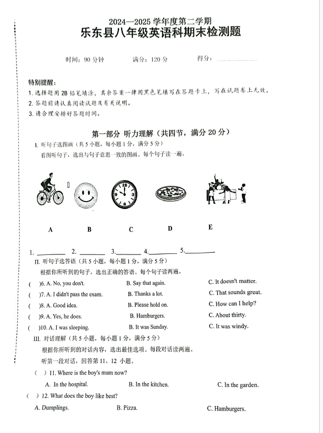 2024-2025学年海南乐东黎族自治县八年级下册英语期末真题(图片版)