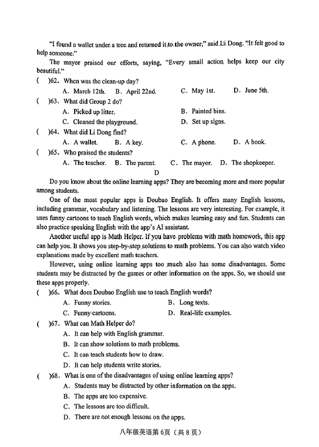 2024-2025学年河北邯郸大名县八年级下册英语期末真题(图片版)(6)