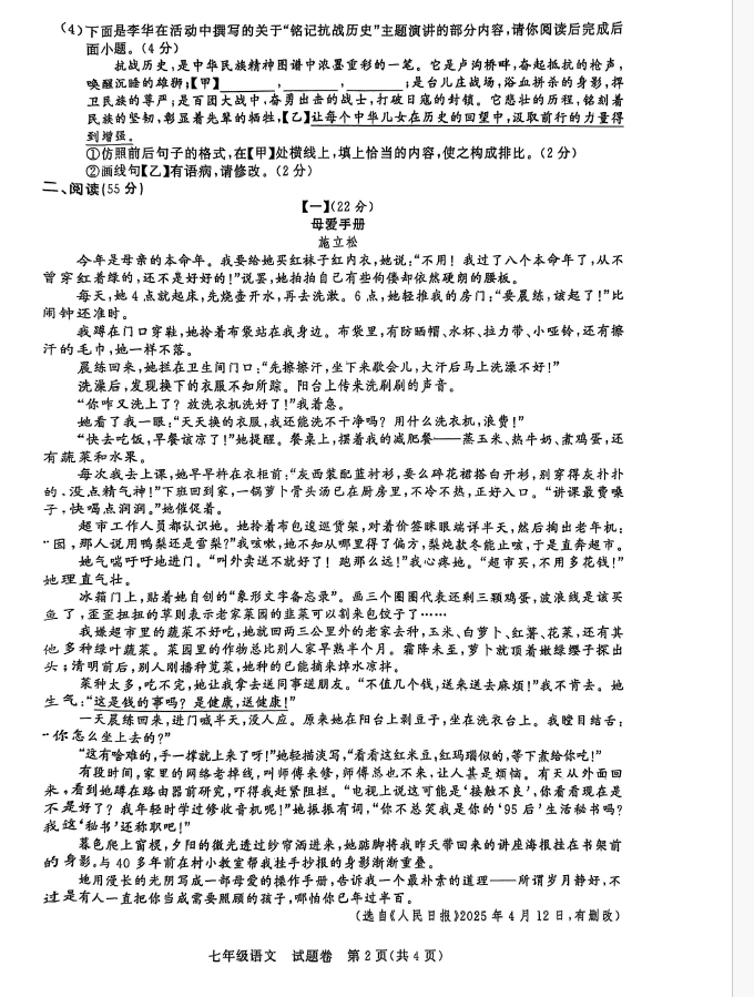 2024-2025学年安徽阜阳太和县七年级下册语文期末真题(图片版)(2)