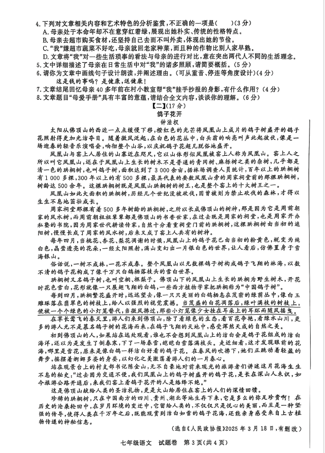 2024-2025学年安徽阜阳太和县七年级下册语文期末真题(图片版)(3)