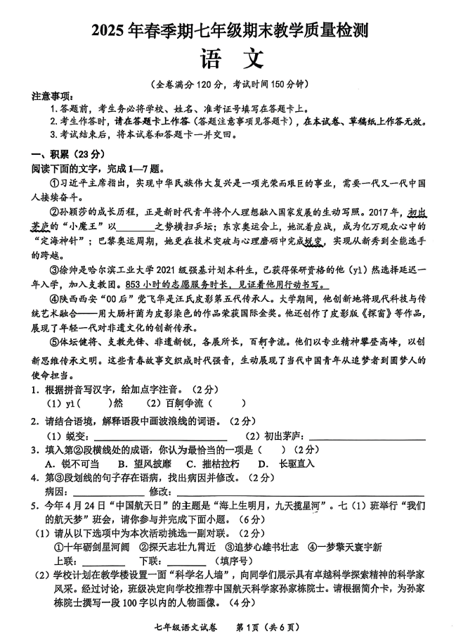 2024-2025学年广西玉林七年级下册语文期末真题(图片版)