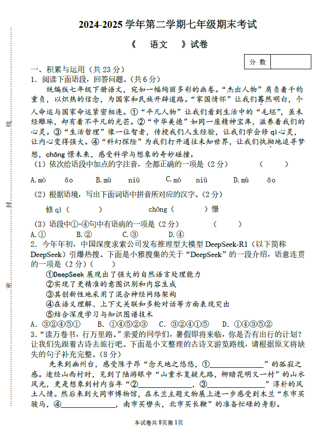 中考网整理了关于2024-2025学年河南新乡七年级下册语文期末真题(图片版),希望对同学们有所帮助,仅供参考。