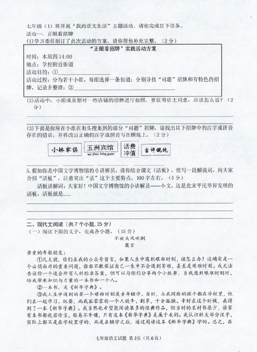 2024-2025学年河南信阳平桥区七年级下册语文期末真题(图片版)(2)
