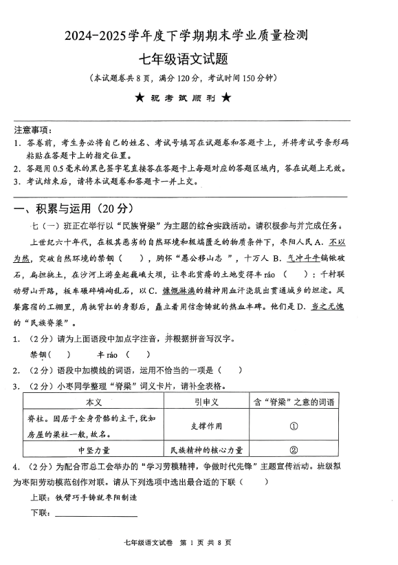 2024-2025学年湖北襄阳枣阳市七年级下册语文期末真题(图片版)