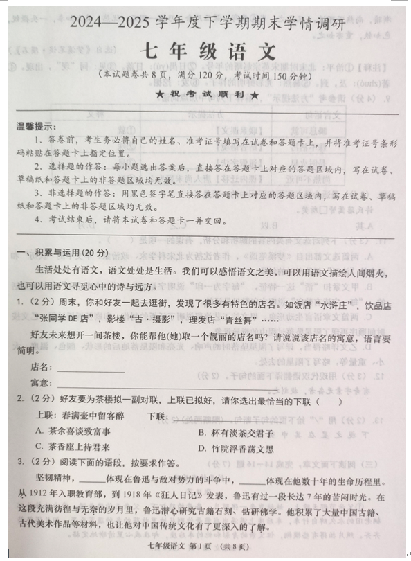 2024-2025学年湖北孝感云梦县七年级下册语文期末真题(图片版)