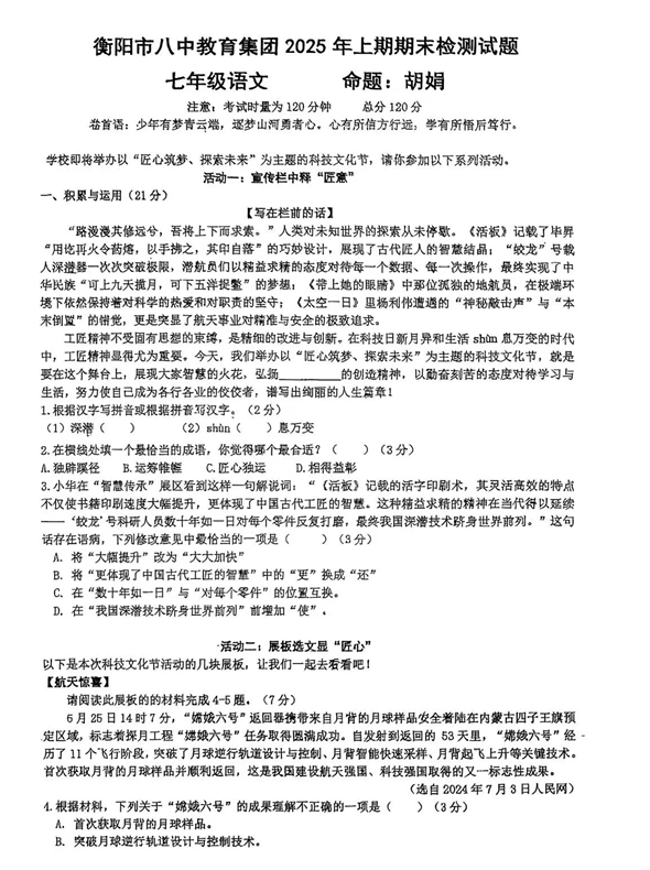 2024-2025学年湖南衡阳八中七年级下册语文期末真题(图片版)