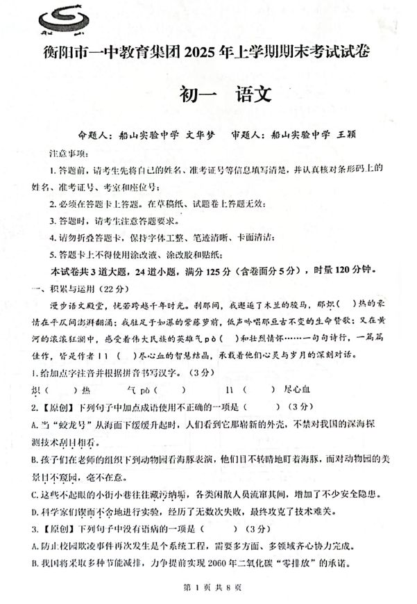 2024-2025学年湖南衡阳一中七年级下册语文期末真题(图片版)