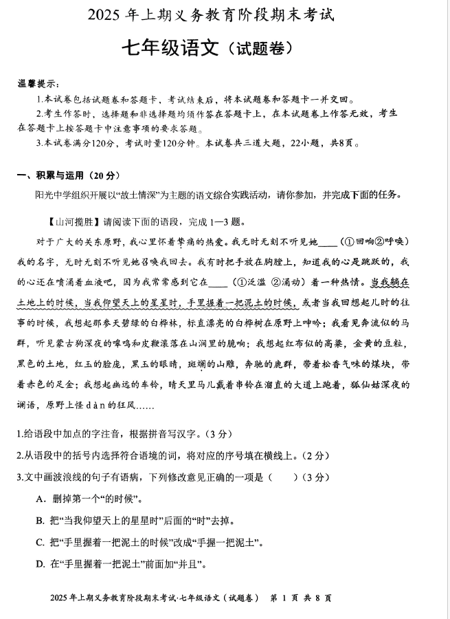 2024-2025学年湖南永州零陵区七年级下册语文期末真题(图片版)