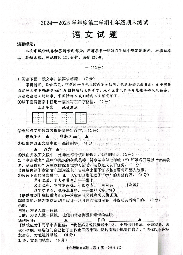 2024-2025学年江苏淮安涟水县七年级下册语文期末真题(图片版)