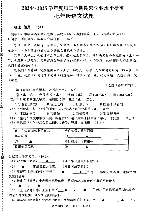 于2024-2025学年江苏连云港灌云县七年级下册语文期末真题(图片版)