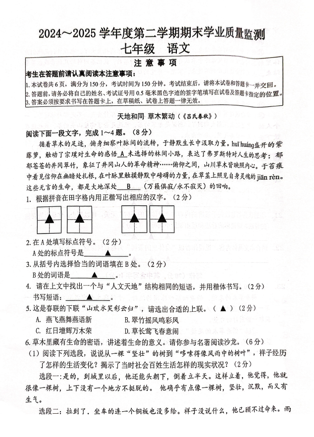 2024-2025学年江苏南通市直联考七年级下册语文期末真题(图片版)