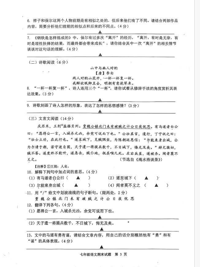 2024-2025学年江苏扬州宝应县七年级下册语文期末真题(图片版)(3)