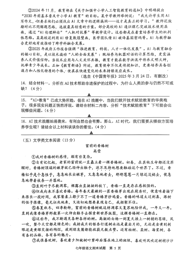 2024-2025学年江苏扬州宝应县七年级下册语文期末真题(图片版)(5)