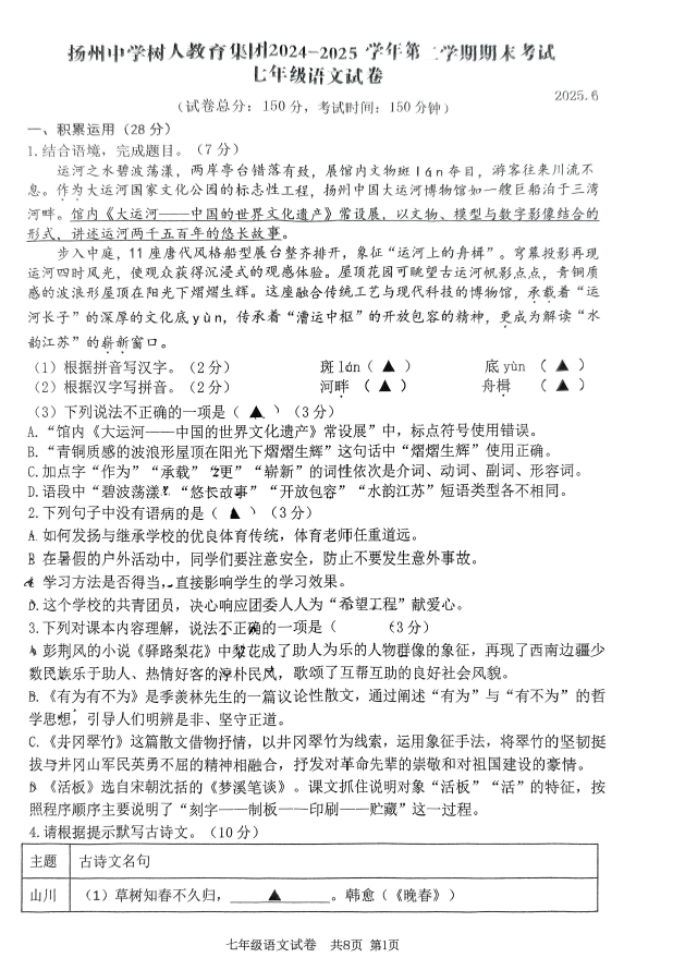 2024-2025学年江苏扬州树人集团七年级下册语文期末真题(图片版)