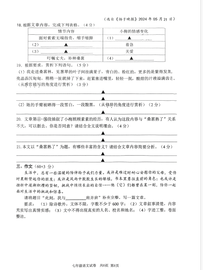 2024-2025学年江苏扬州树人集团七年级下册语文期末真题(图片版)(7)