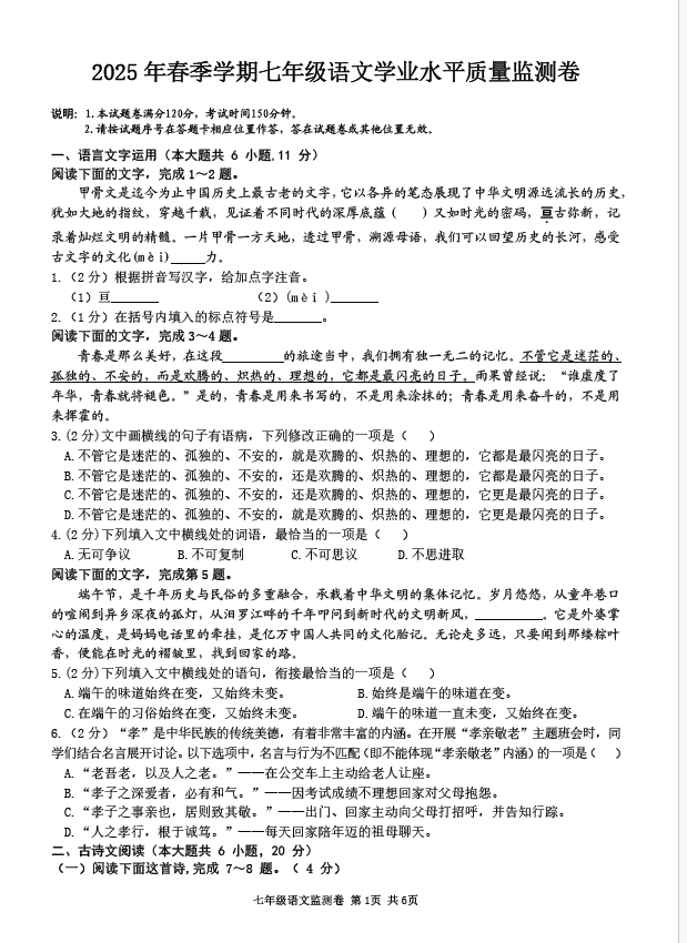2024-2025学年江西丰城市七年级下册语文期末真题(图片版)