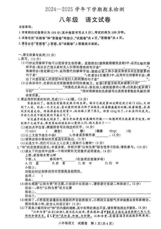 2024-2025学年安徽阜阳太和县联考八年级下学期语文期末真题(图片版)