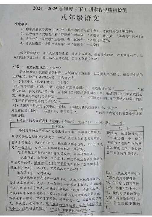 2024-2025学年安徽合肥肥西县八年级下学期语文期末真题(图片版)