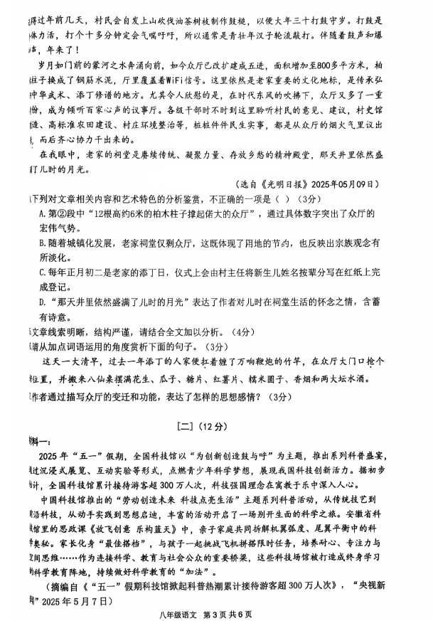 2024-2025学年安徽合肥五十中西校八年级下学期语文期末真题(图片版)(3)