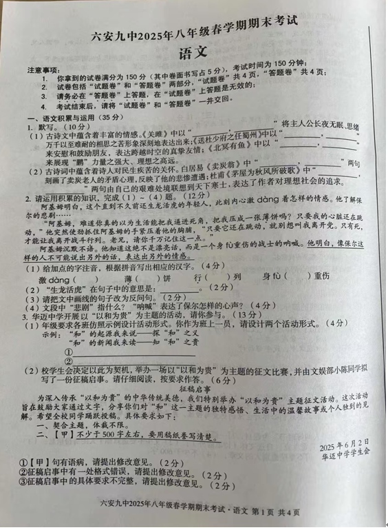 2024-2025学年安徽六安九中八年级下学期语文期末真题(图片版)