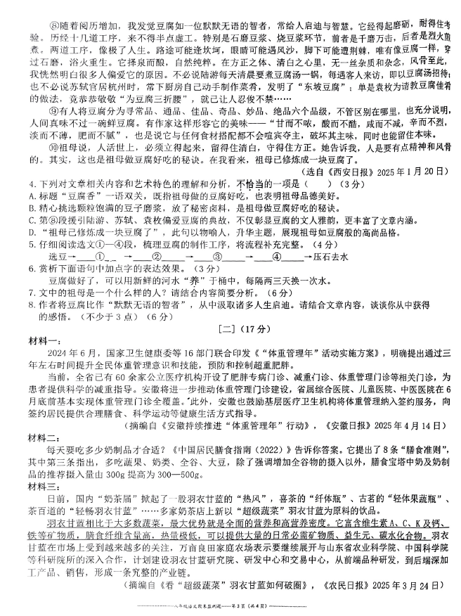 2024-2025学年安徽铜陵枞阳县八年级下学期语文期末真题(图片版)(3)