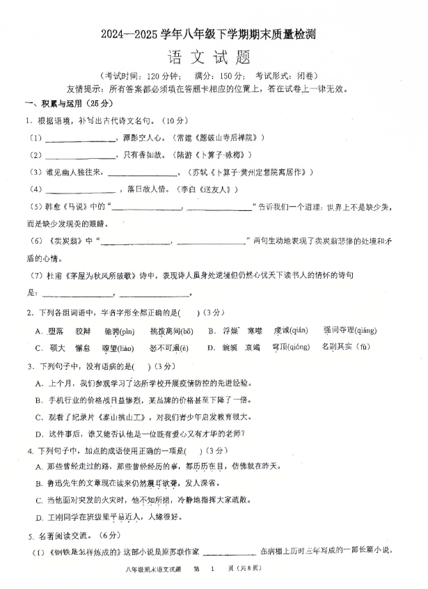 2024-2025学年福建福州金山中学八年级下学期语文期末真题(图片版)