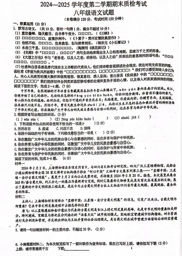 2024-2025学年广东揭阳惠来县一中八年级下学期语文期末真题(图片版)