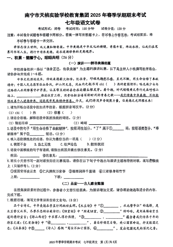 2024-2025学年广西南宁天桃实验学校八年级下学期语文期末真题(图片版)