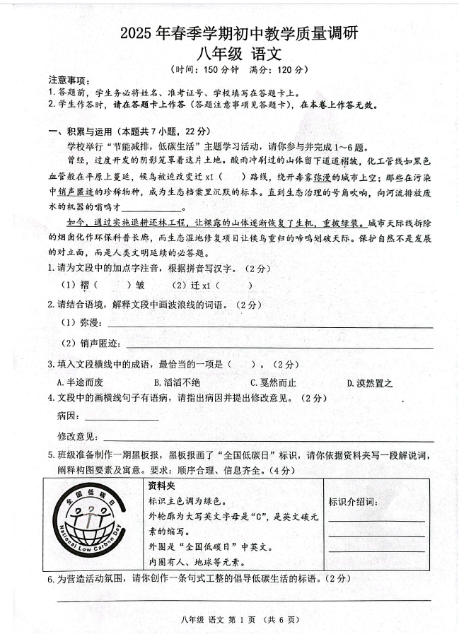 2024-2025学年广西来宾八年级下学期语文期末真题(图片版)