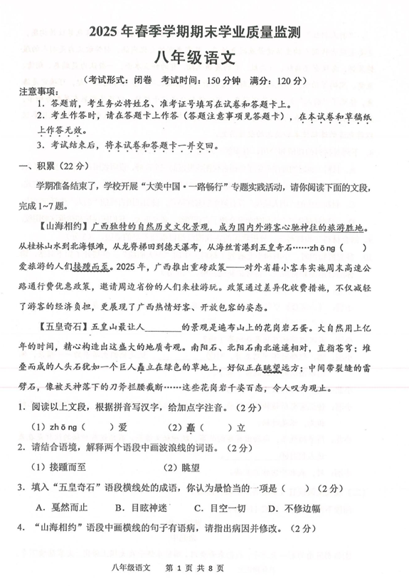 2024-2025学年广西钦州八年级下学期语文期末真题(图片版)