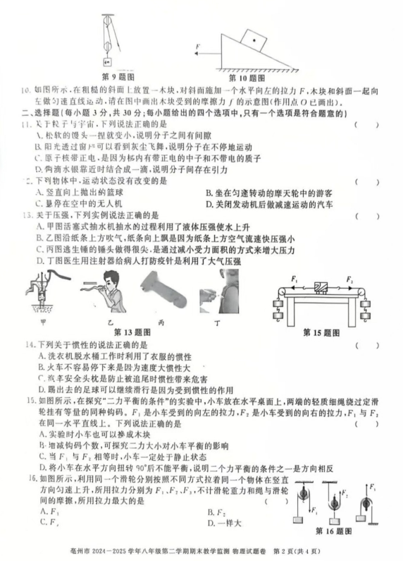 2024-2025学年安徽亳州八年级下册物理期末真题(图片版)(2)