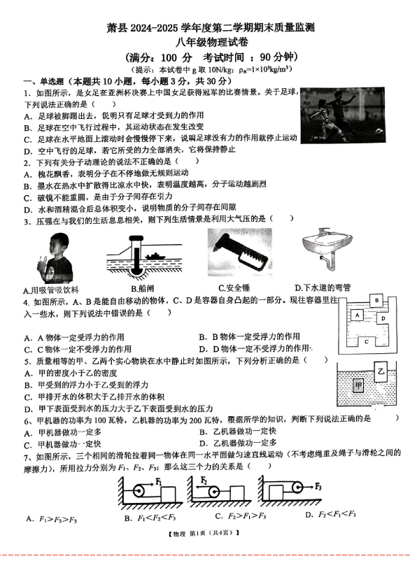 2024-2025学年安徽宿州萧县八年级下册物理期末真题(图片版)