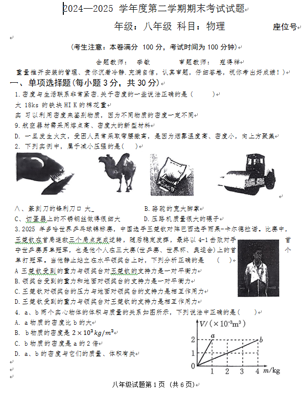 2024-2025学年甘肃白银十一中八年级下册物理期末真题(图片版)