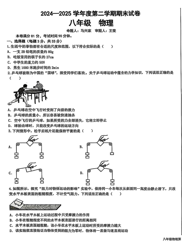 2024-2025学年甘肃兰州八十一中学八年级下册物理期末真题(图片版)