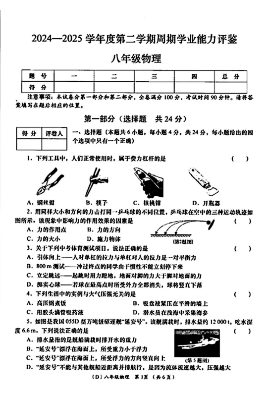 2024-2025学年甘肃陇南礼县县八年级下册物理期末真题(图片版)