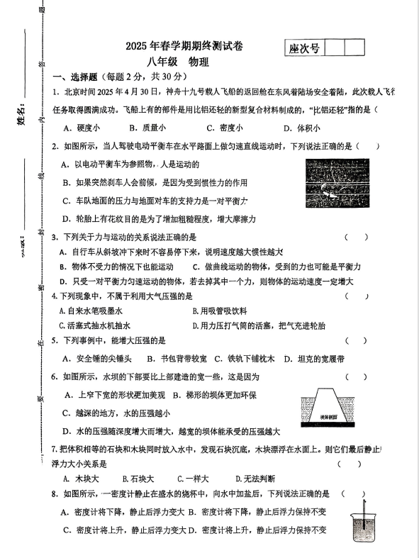 2024-2025学年甘肃张掖甘州中学八年级下册物理期末真题(图片版)