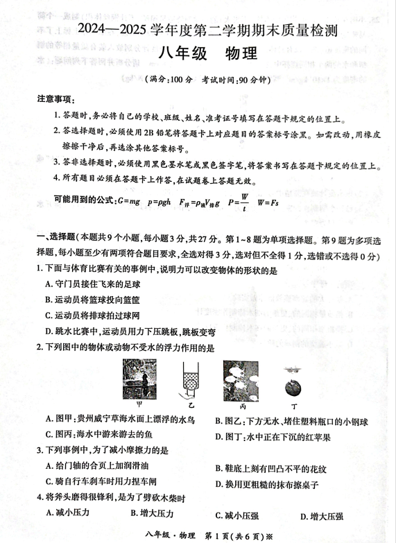 2024-2025学年贵州毕节大方县八年级下册物理期末真题(图片版)