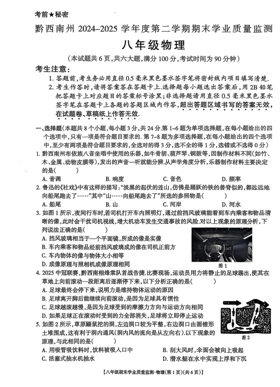 2024-2025学年贵州黔西南州八年级下册物理期末真题(图片版)