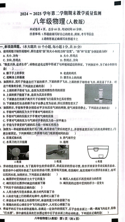 2024-2025学年河北沧州南皮县八年级下册物理期末真题(图片版)