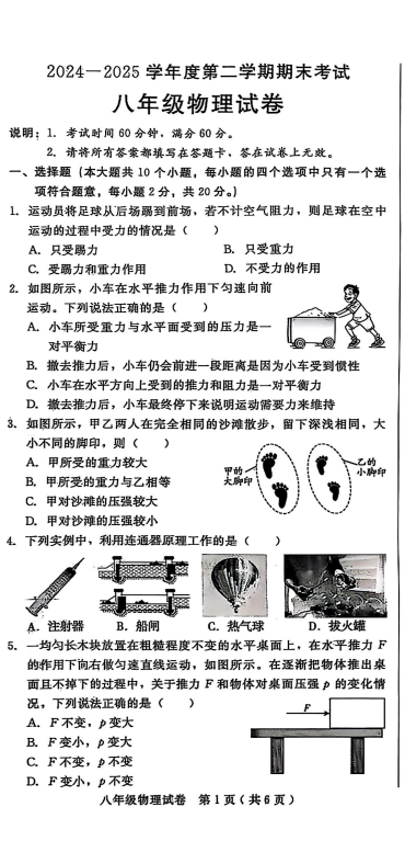 2024-2025学年河北邯郸复兴区八年级下册物理期末真题(图片版)