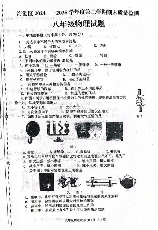 2024-2025学年河北秦皇岛海港区八年级下册物理期末真题(图片版)