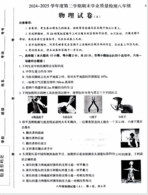 2024-2025学年河北石家庄赵县八年级下册物理期末真题(图片版)