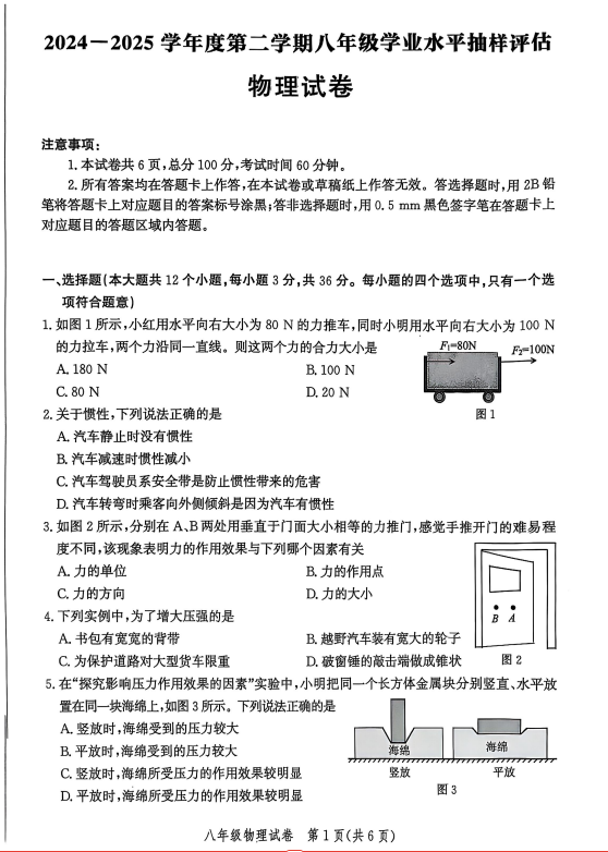 2024-2025学年河北唐山迁安八年级下册物理期末真题(图片版)