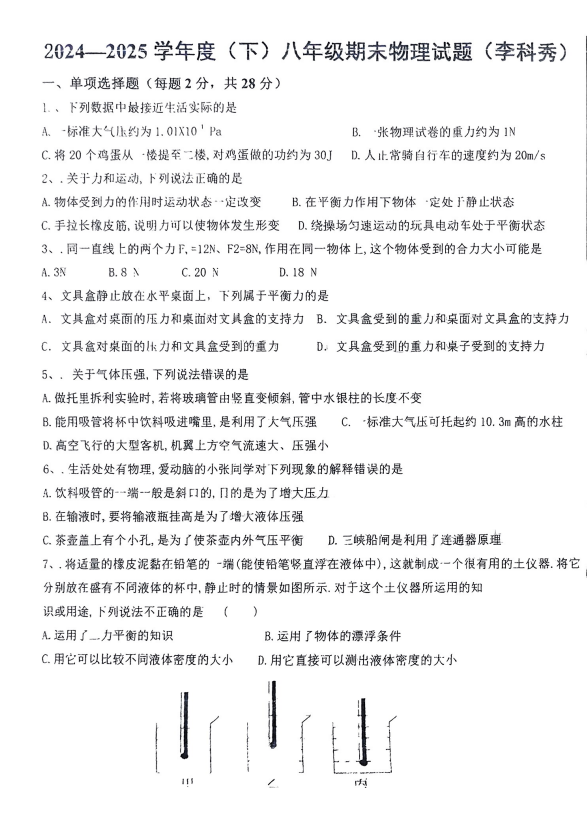 2024-2025学年黑龙江佳木斯富锦八年级下册物理期末真题(图片版)