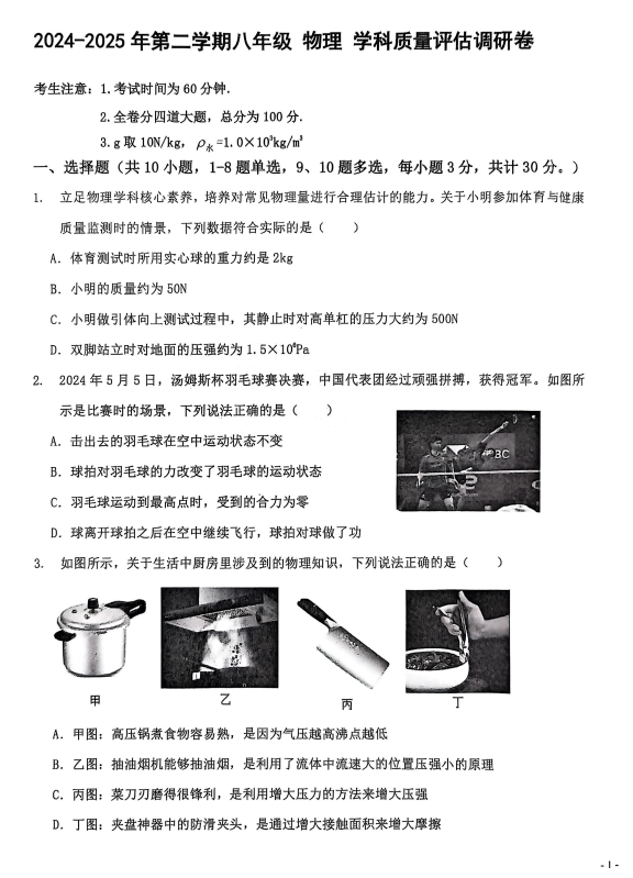 2024-2025学年黑龙江绥化明水县八年级下册物理期末真题(图片版)