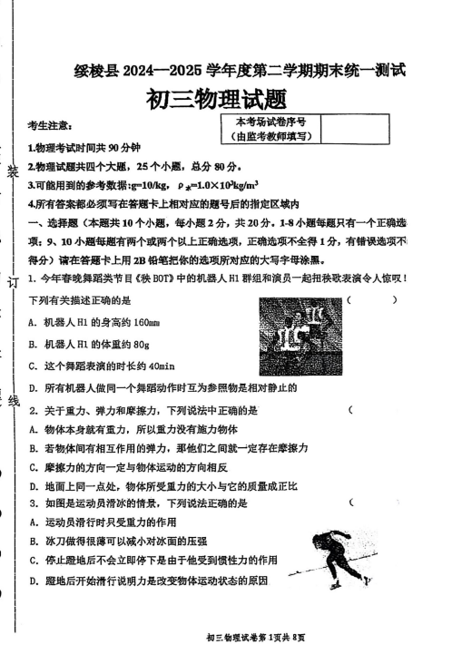于2024-2025学年黑龙江绥化绥棱县八年级下册物理期末真题(图片版)