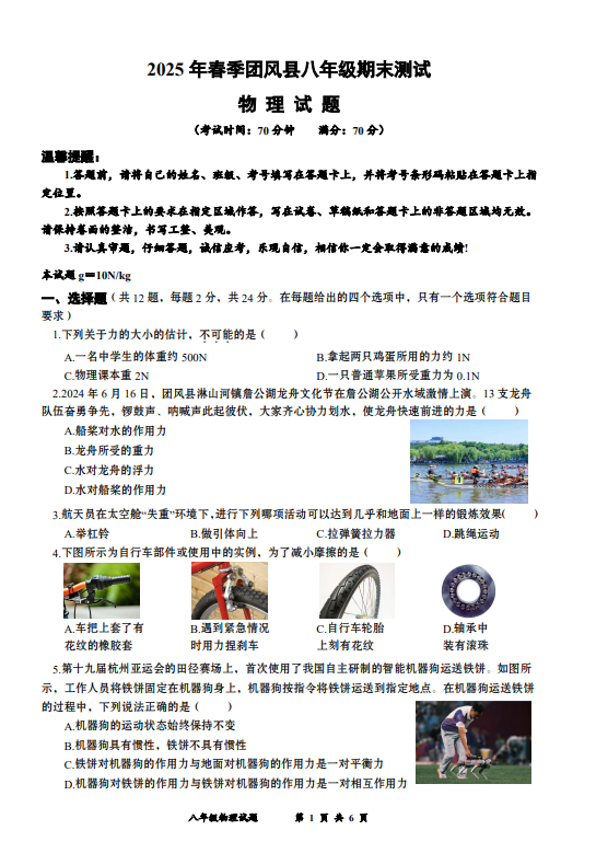 2024-2025学年湖北黄冈团风县八年级下册物理期末真题(图片版)