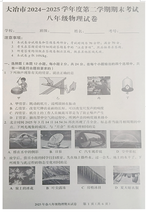 2024-2025学年湖北黄石大冶市八年级下册物理期末真题(图片版)