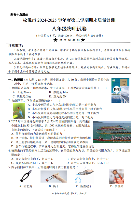 2024-2025学年湖北荆州松滋市八年级下册物理期末真题(图片版)